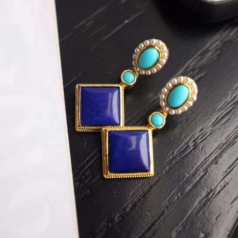 Retro Gold & Lapis Square Blue Dangle Earrings